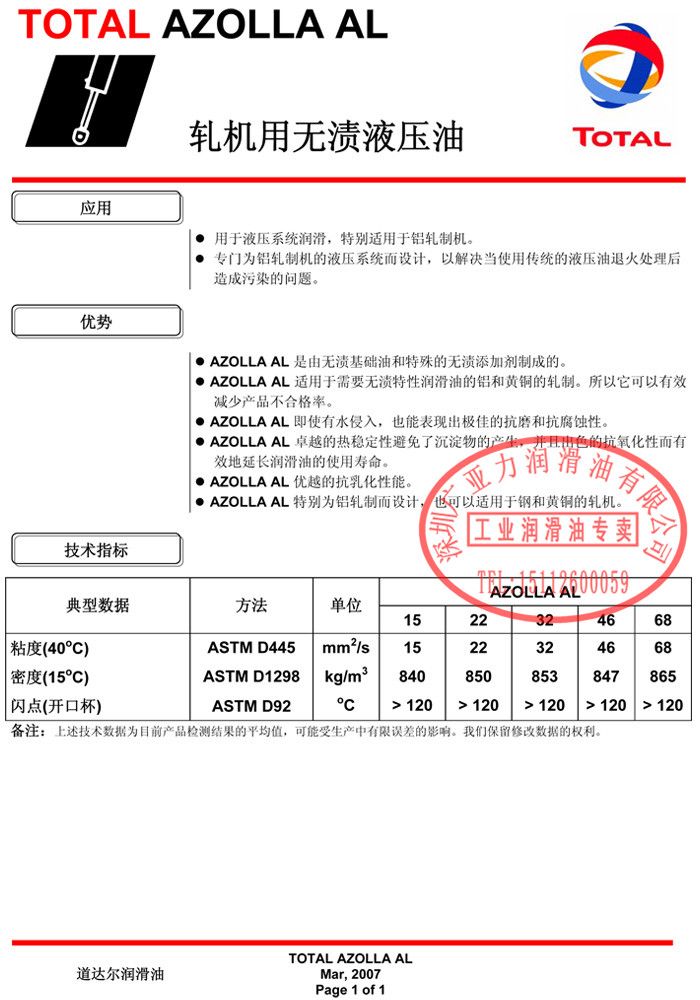 道达尔AZOLLA AL系列-轧机用无渍液压油 详细说明 浏览3781次