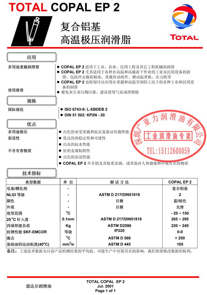 道达尔COPAL EP 2 —复合铝基高温极压润滑脂 详细说明 浏览2636次